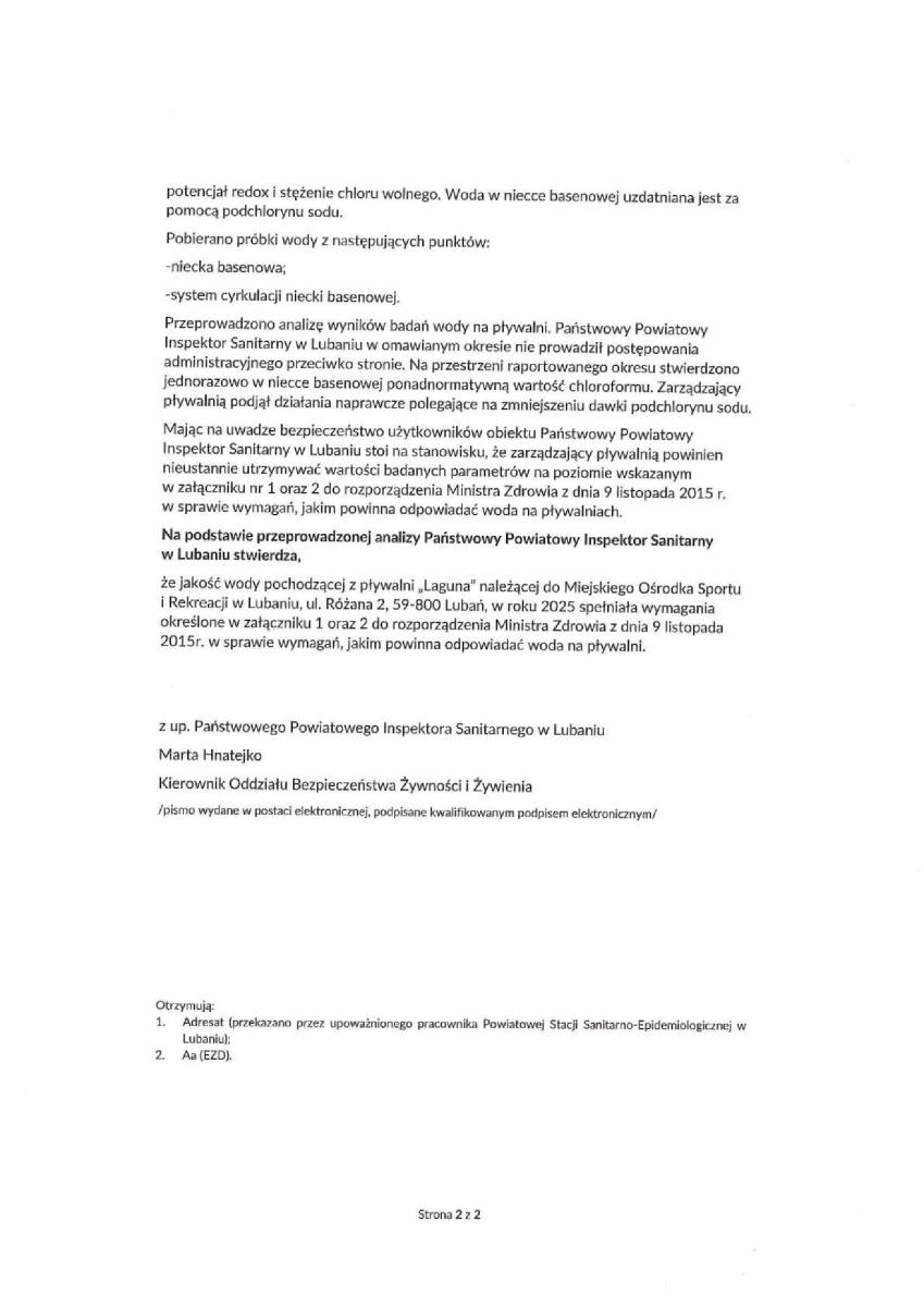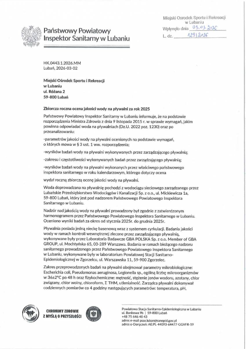 Zbiorcza roczna ocena jakości wody na pływalni za 2025 rok.